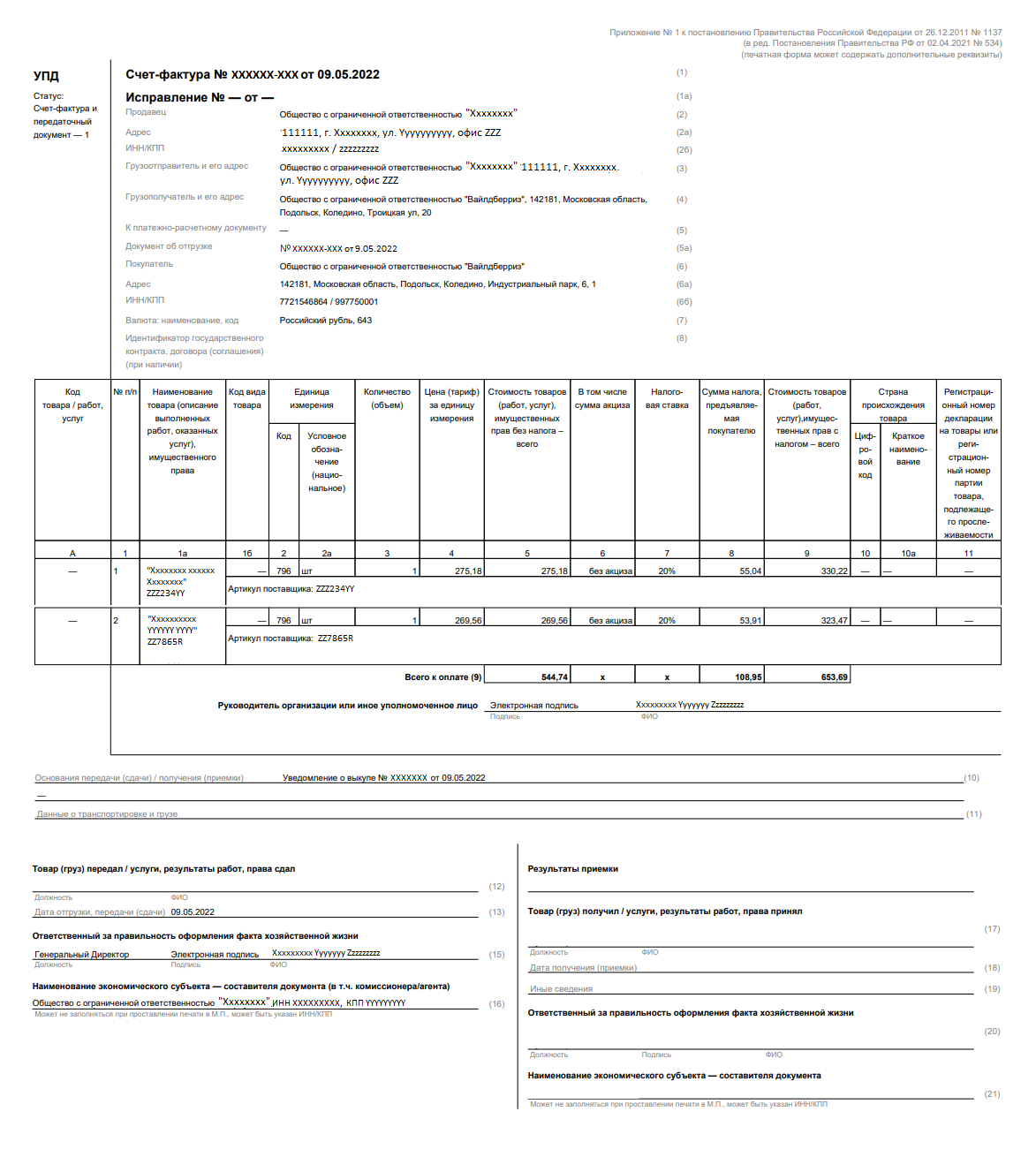 1. В основании УПД должно быть указано: «Уведомление о выкупе № (Номер указан внутри уведомления о выкупе) от (дата от которой сформировано уведомление, указано внутри уведомления, рядом с его номером).»